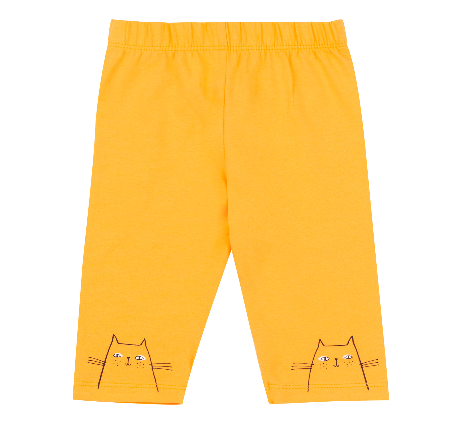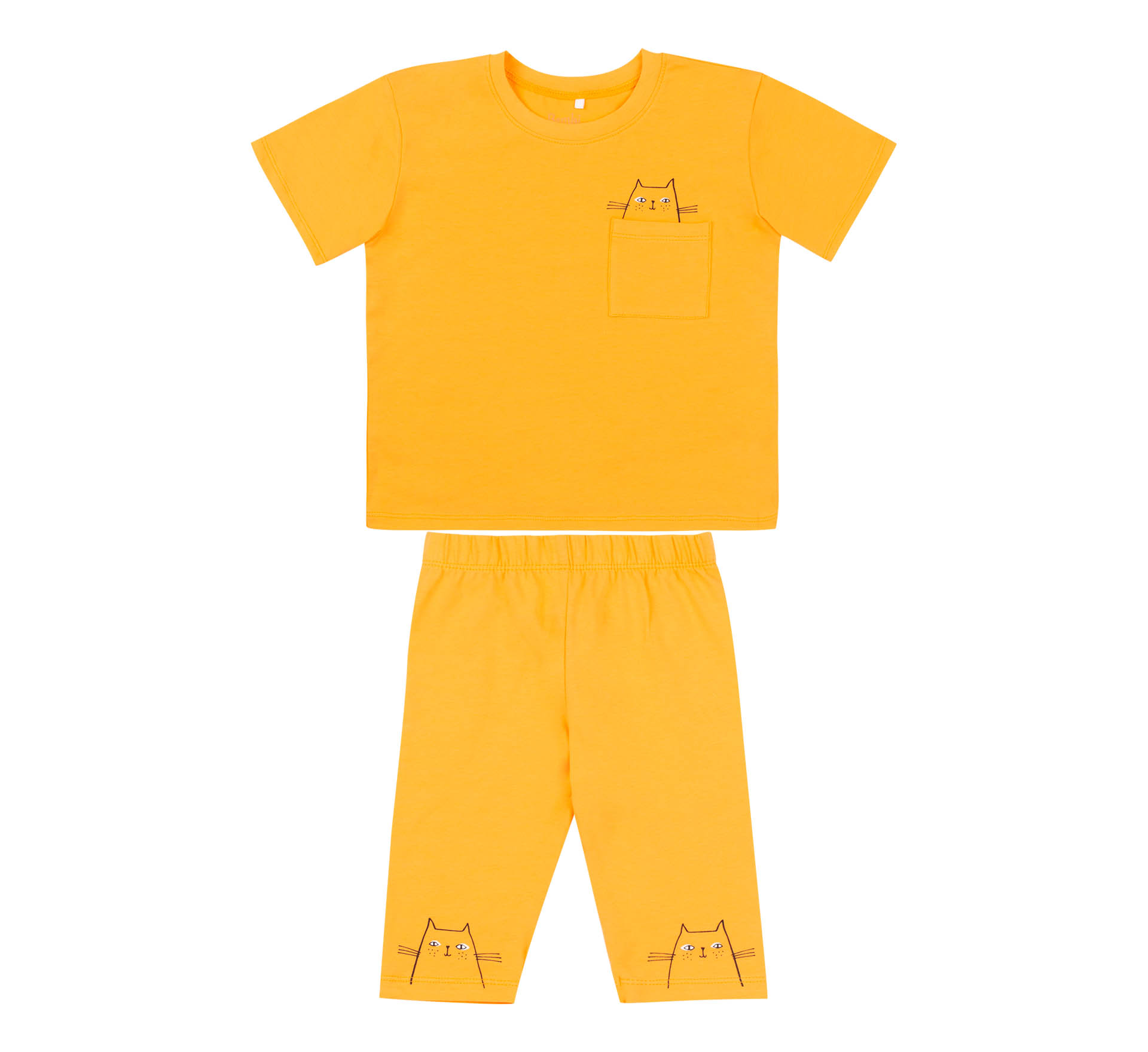 Жовтий літній дитячий костюм для дівчаток. Складається з футболки та шортів з оригінальним принтом Котики. Пошитий з тонкого бавовоняного трикотажу, легкий, зручний, тканина не парить. Шорти на еластичному поясі та з принтом на колінах. Футболка вільна, з накладною кишенею і принтом.