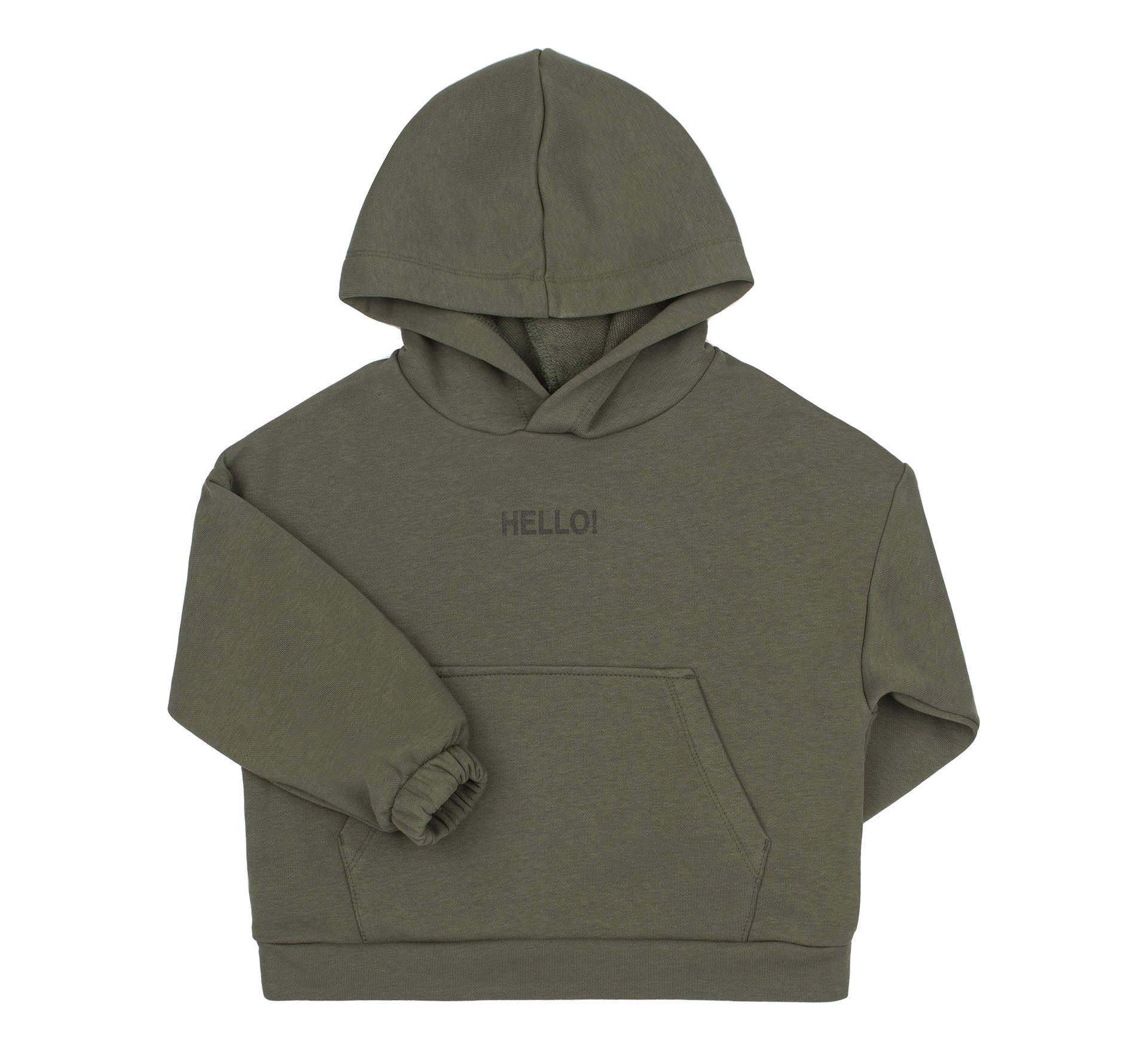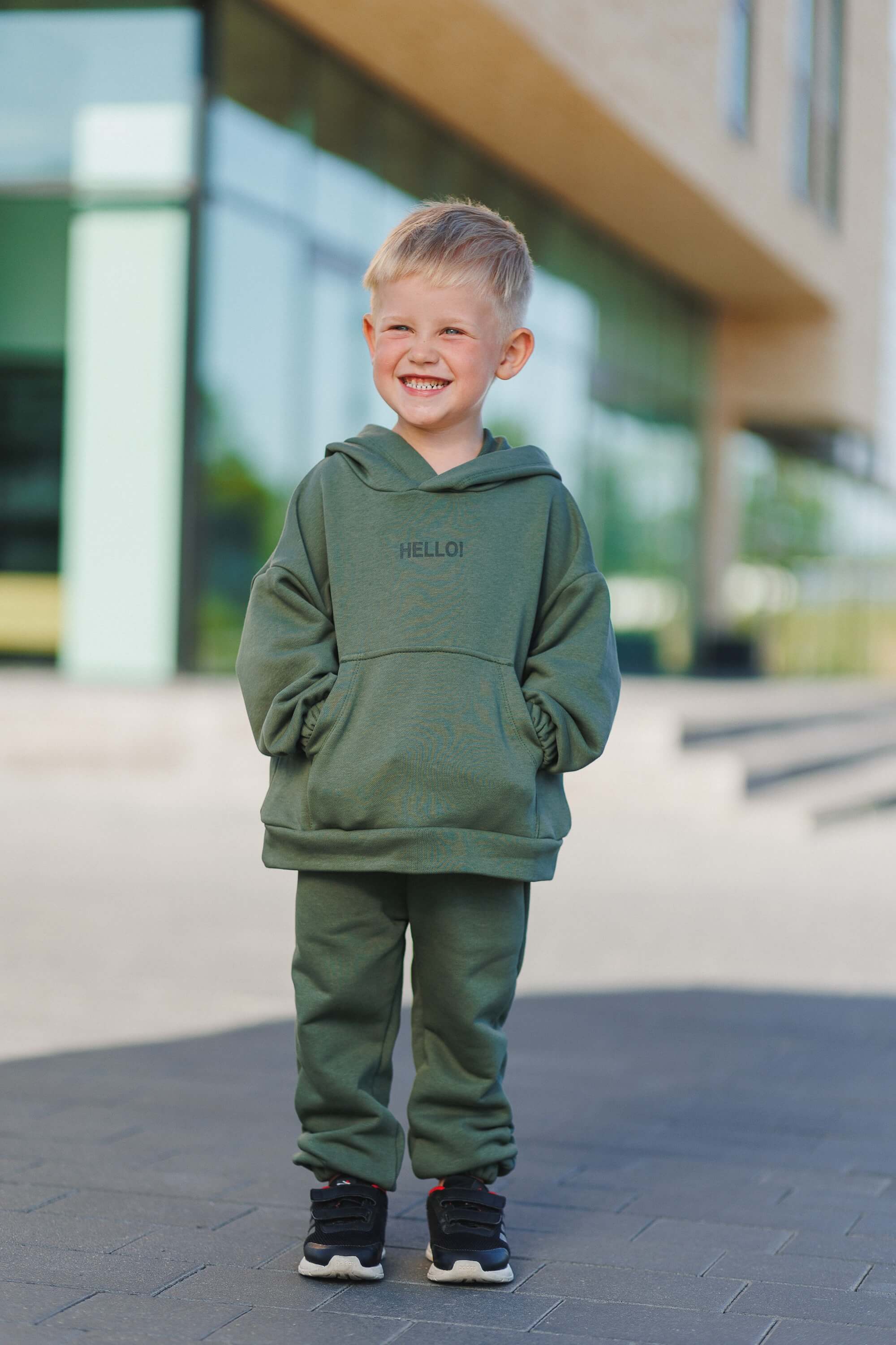 Дитячий костюм хакі з трикотажу тринитка. Складається з кофти з капюшоном та спортивних штанів. Дитяче худі прикрашене написом Hello!Має зручну кишеню кенгуру та довгий зібраний по краю рукав. Штани з еластичним поясом та зібрані по краю, по бокаам мають кишені з косим входом. Тканина на дитячий спортивний костюм використана бавовняна та цупка. Тринитка чудова тим, що при щільності чудово пропускає повітря, тому підходить на різний температурний режим.
