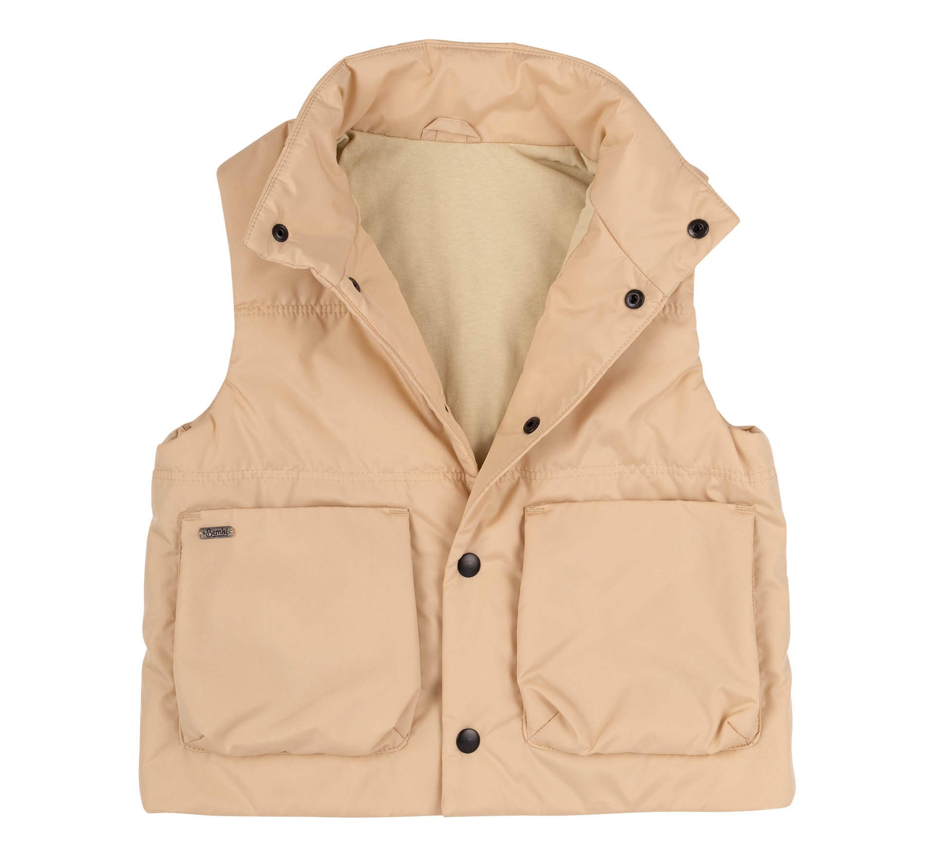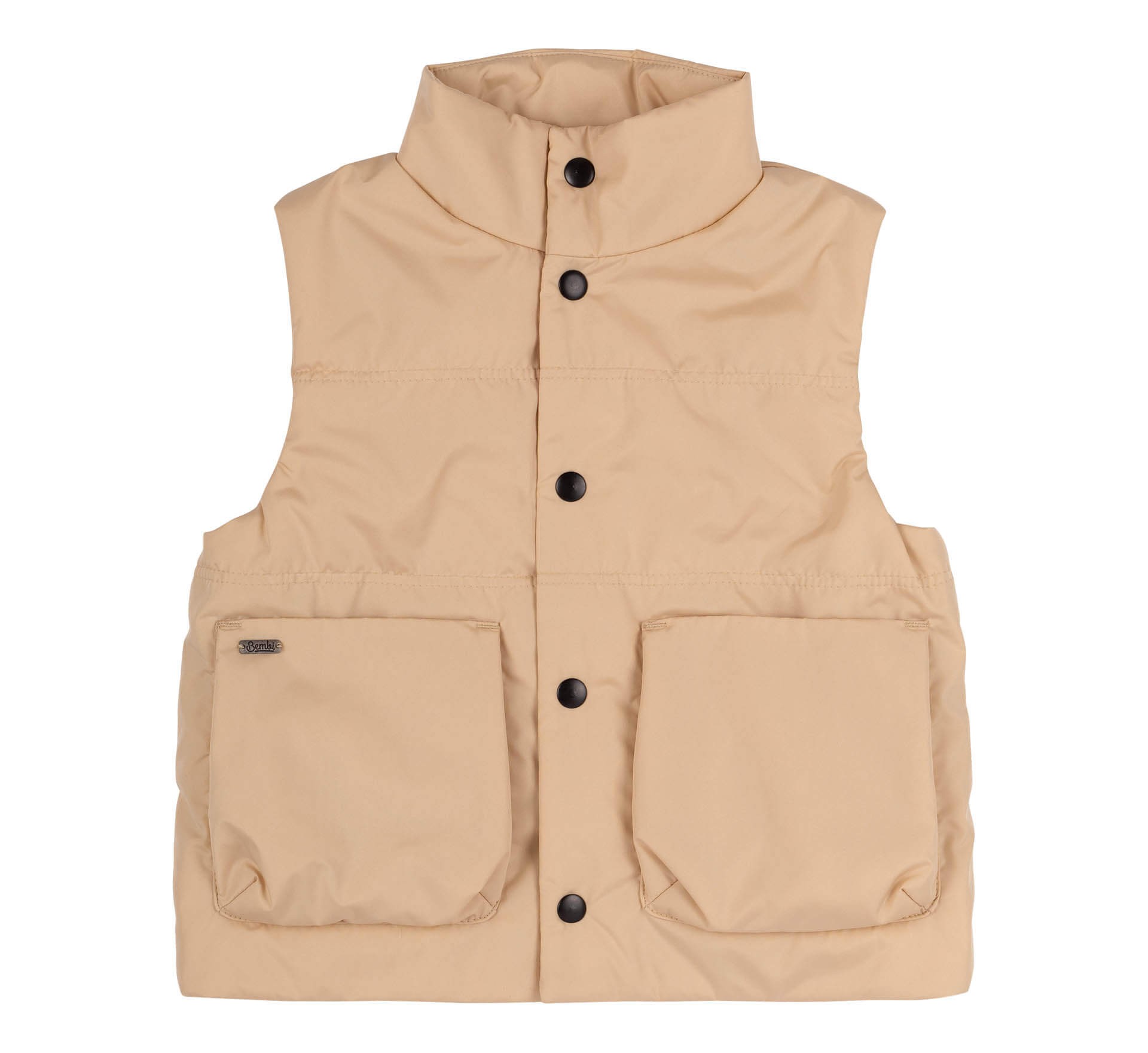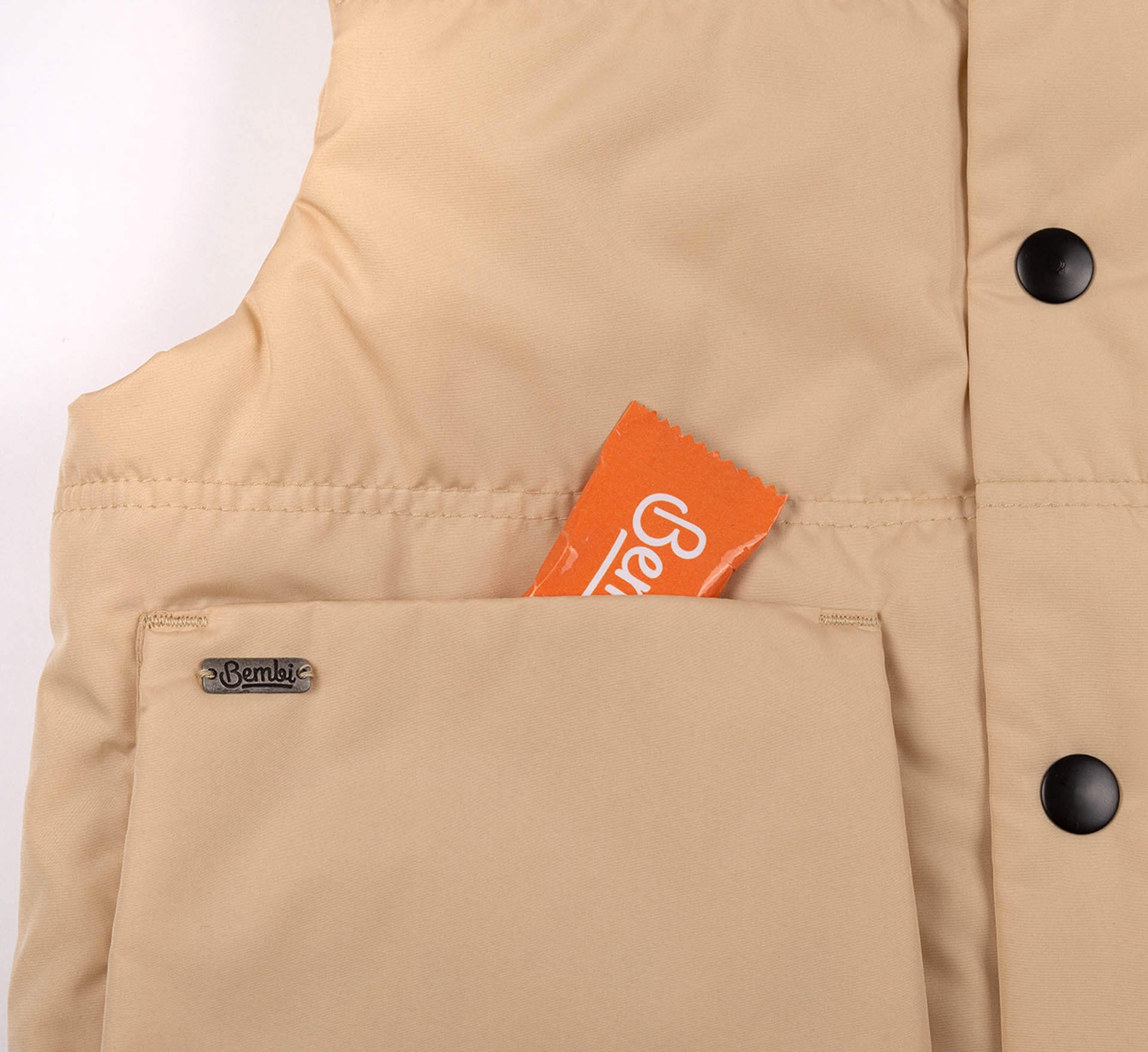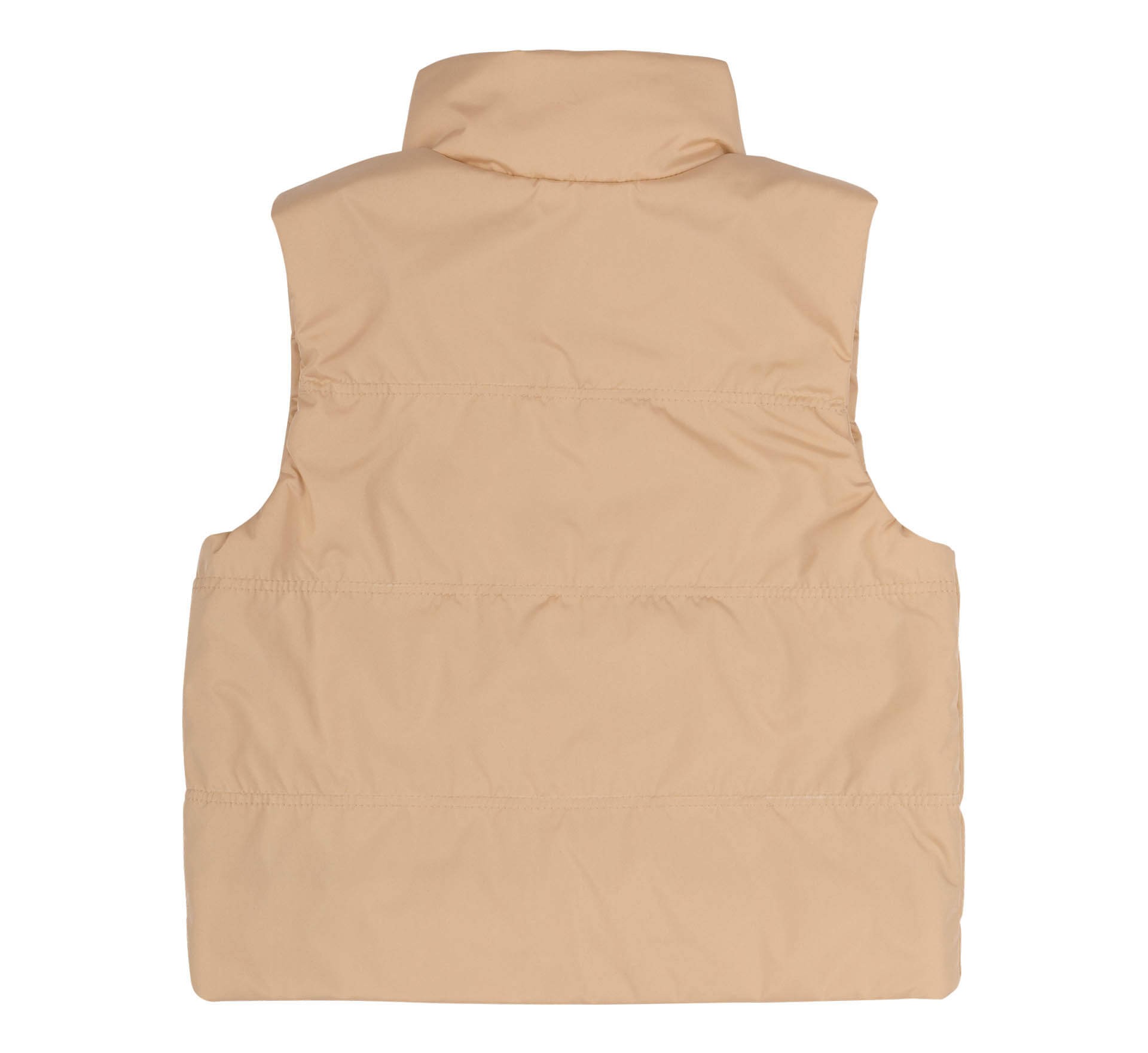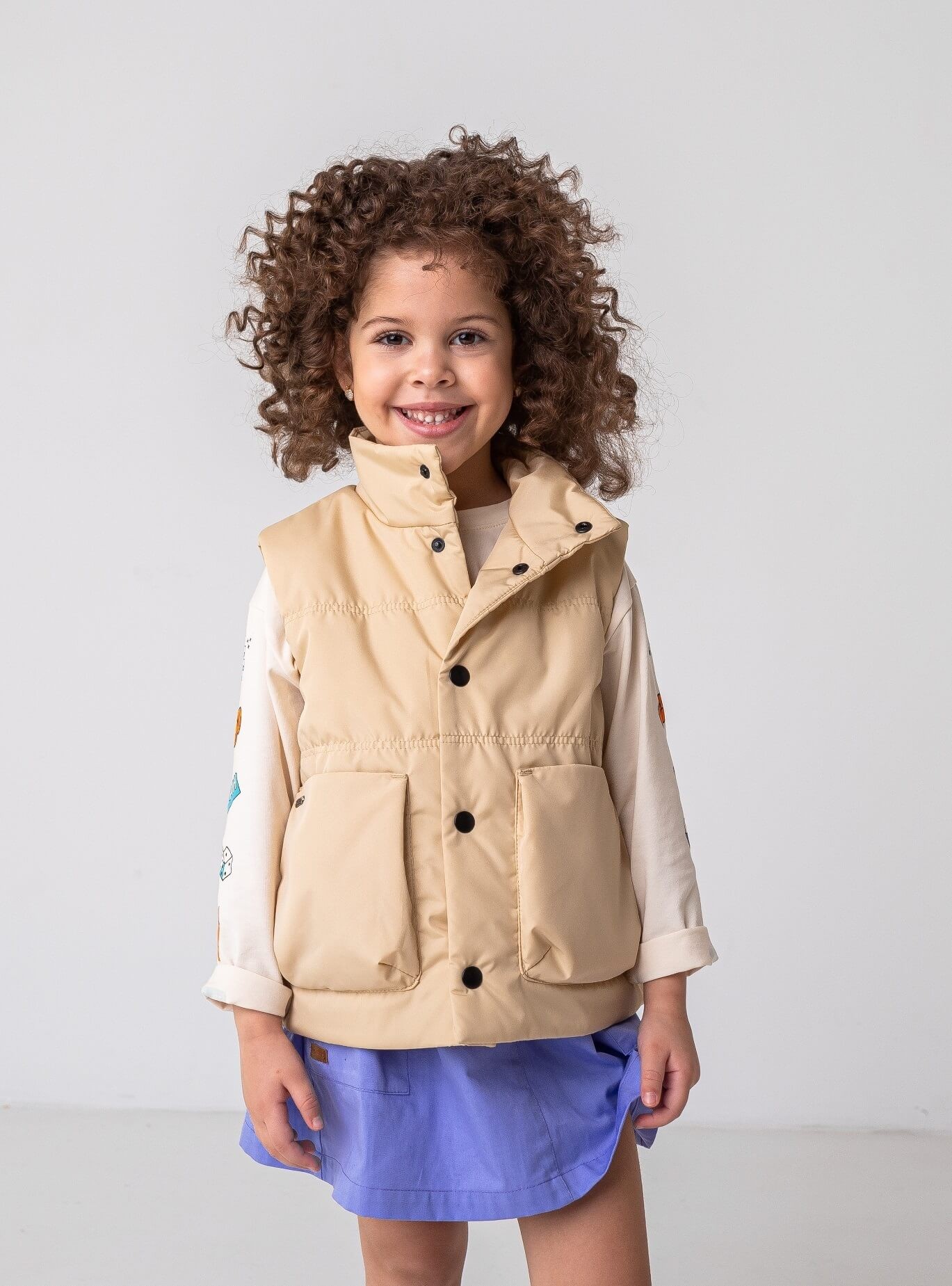 Стильна бежева дитяча жилетка для дівчинки. Жилет без капюшону, з великими об'ємними накладними кишенями. На одній з кишень пришито металевий штильд з емблемою виробника. Застібається на кнопочки. Горловина оформлена високою стійкою. Є петелька для зручного зберігання.
