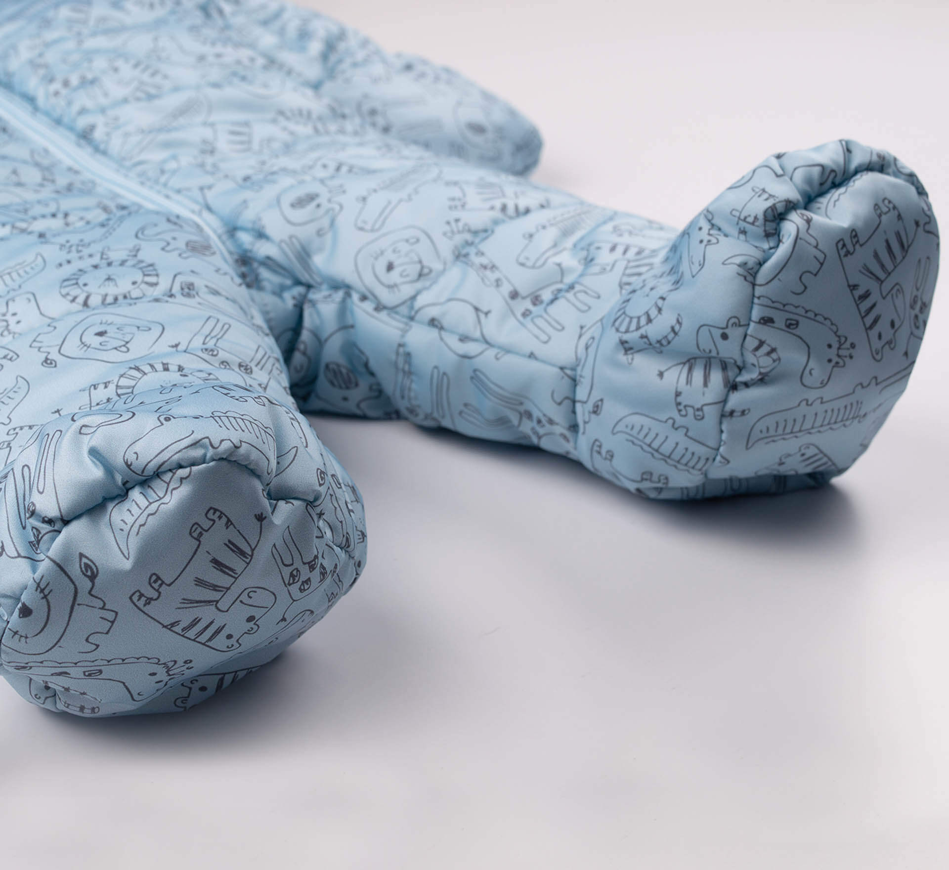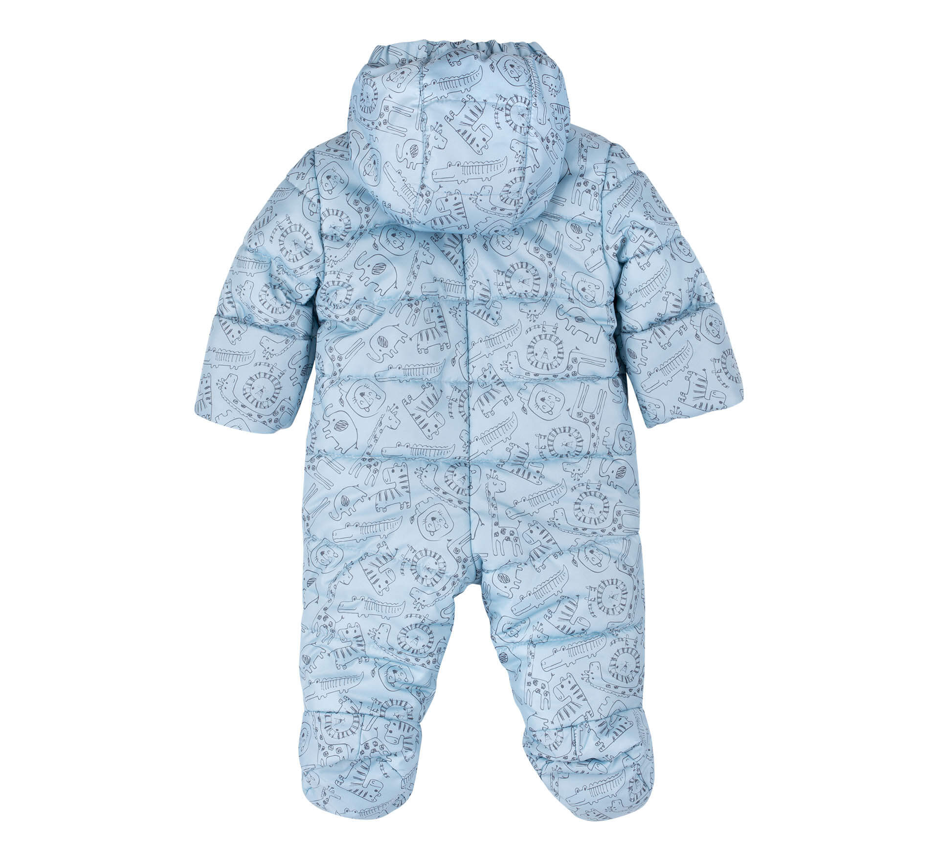 Теплий блакитний зимовий дитячий комбінезон з принтом. Має закриті ніжки та нашиті рукавички на край рукава (можна носити відвернутими, або відкривши ручки). Застібається на замочок з захистом борідки. Капюшон зібраний по краю.