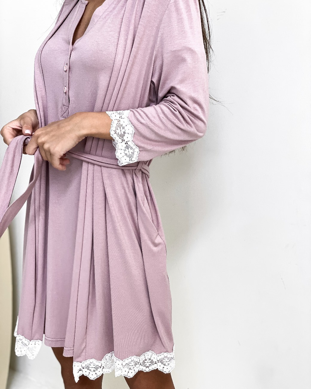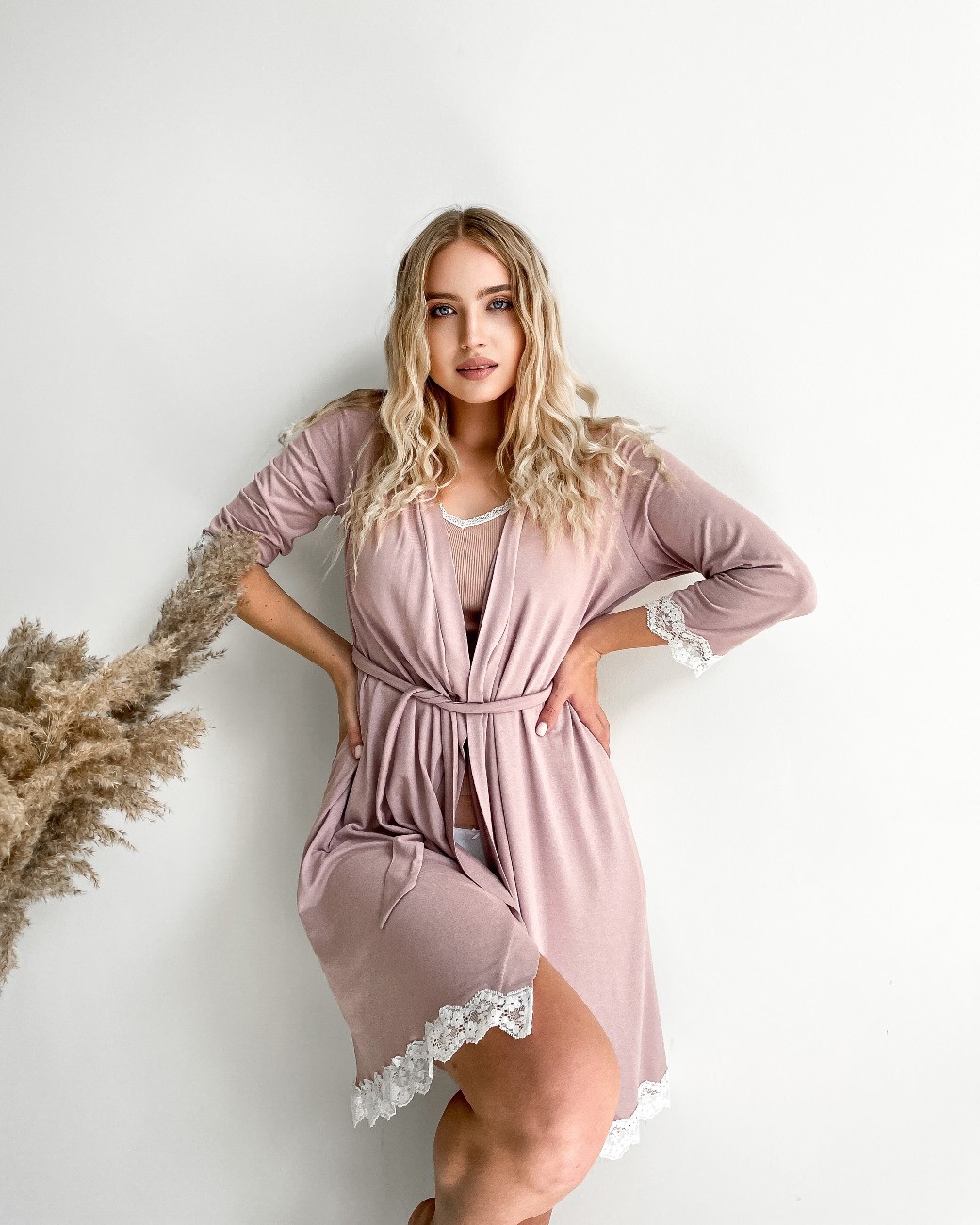 Легкий віскозний халат з мереживом вільного крою на запах. Має рукав довжиною три чверті, по краю рукава та самого халата нашито ніжне мереживо, яке дуже прикрашає виріб та додає образу витонченості.