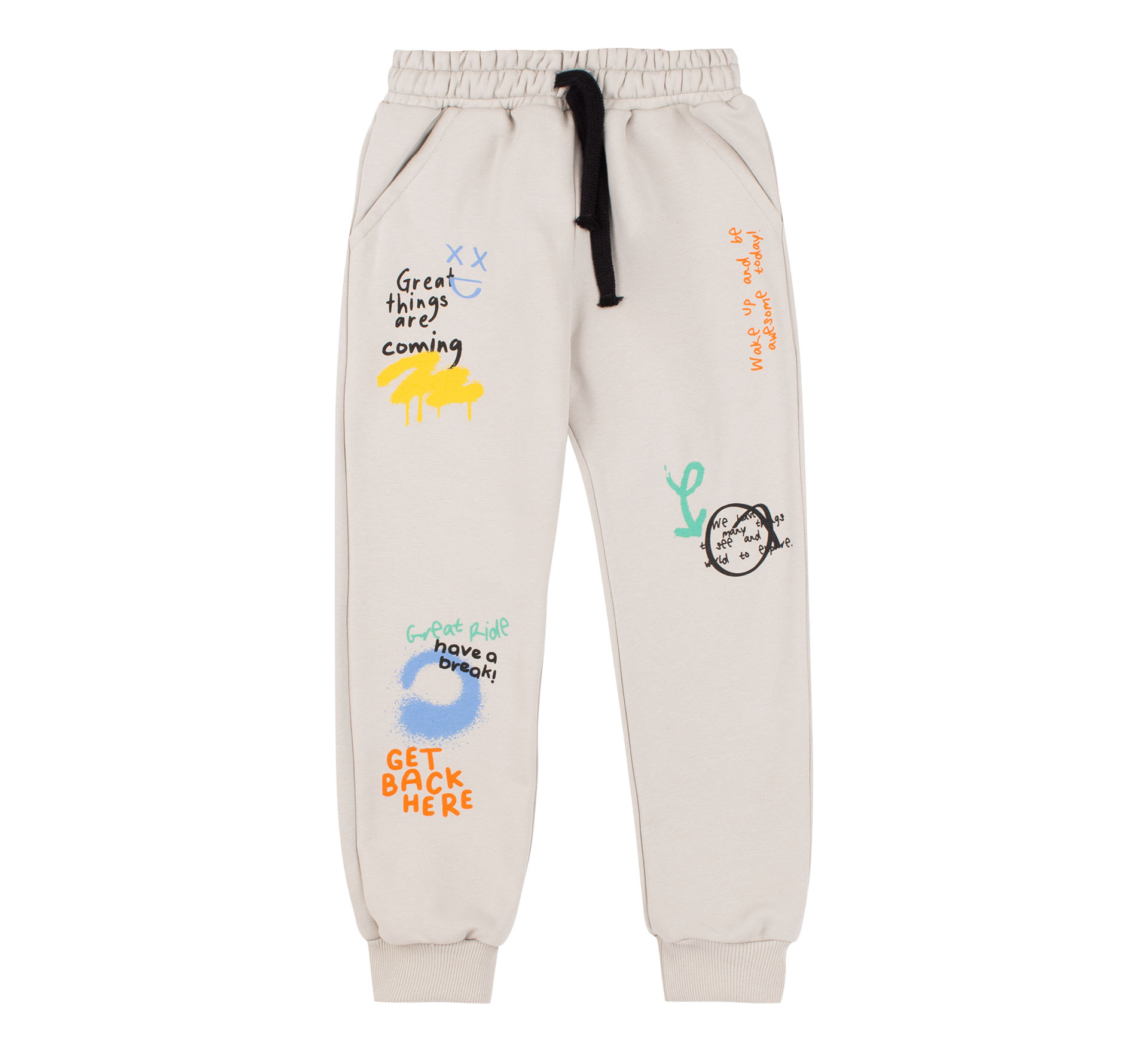 Бежеві дитячі спортивні штани для хлопчика. Прикрашені написами. Пошиті з трикотажу тринитка. По бокам зручні кишені з косим входом. Пояс на резинці, зі шнурочками. Край штанів зібраний манжетами з трикотажу в рубчик.