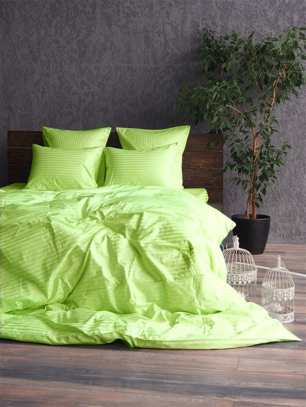 Підодіяльник: На блискавки, шов білизняний Простирадло: Забарвлення як верх підковдри Наволочки: На запах, шов білизняний Плетіння тканини: сатин-страйп, смужка 2/2см