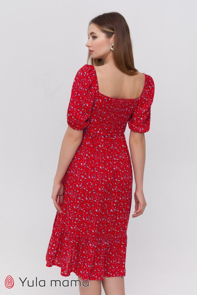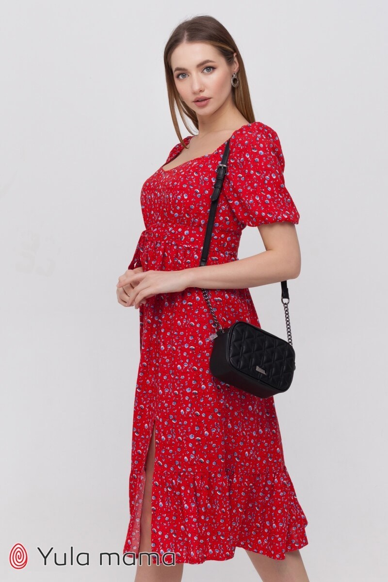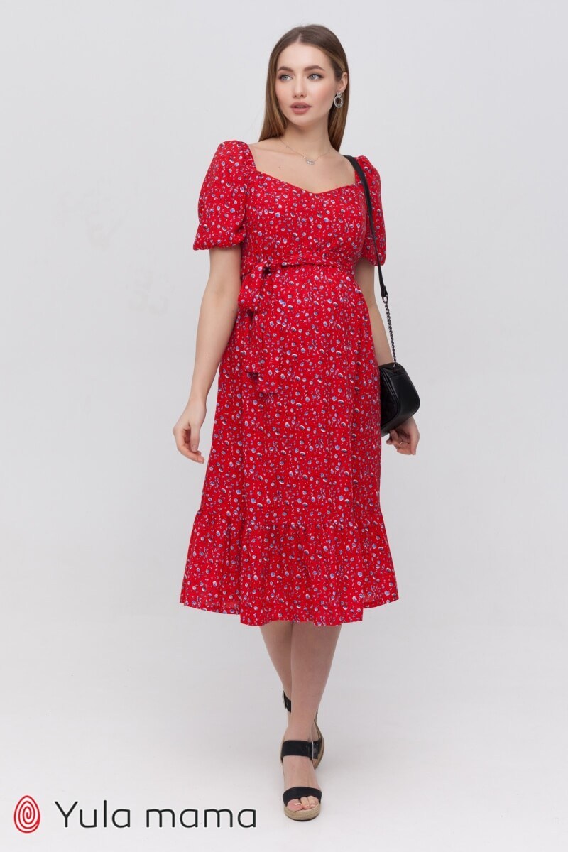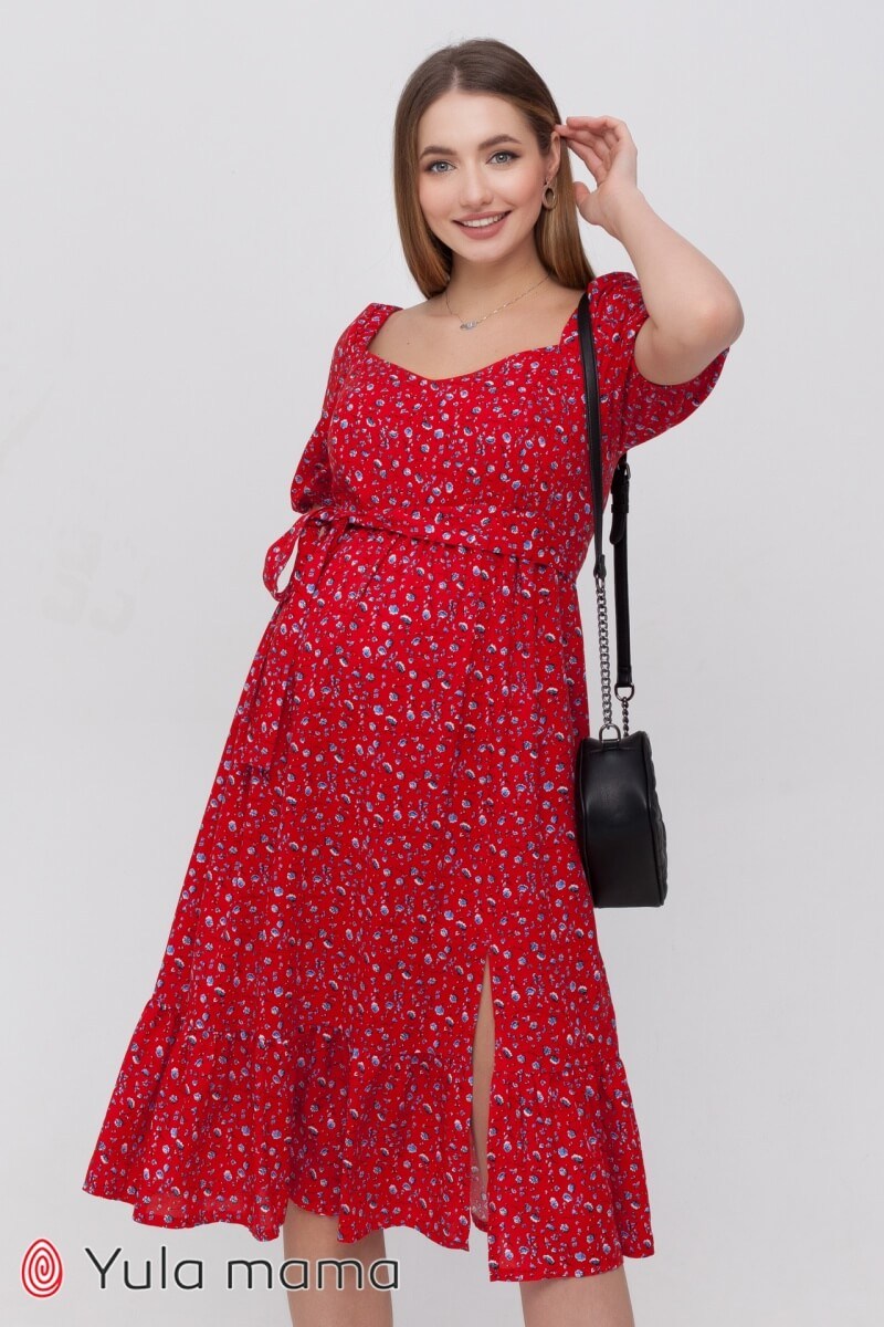 Дуже жіночне червоне плаття з квітковим принтом для вагітних та годуючих. Плаття з рукавами-буфами та ефектним розрізом з лівого боку виділить Вас з натовпу. Облягаючий ліф має потайні замочки для годування. Вільна спідниця дзвіночком з воланом по краю помістить навіть животик на 9 місяці вагітності та гарно лягає потім.