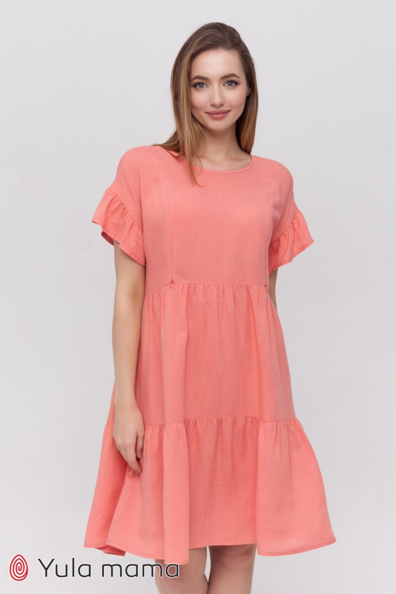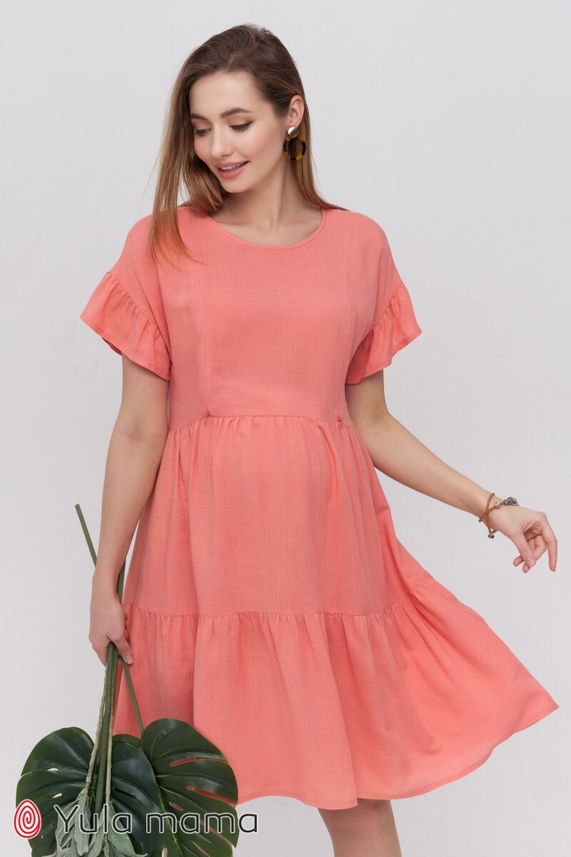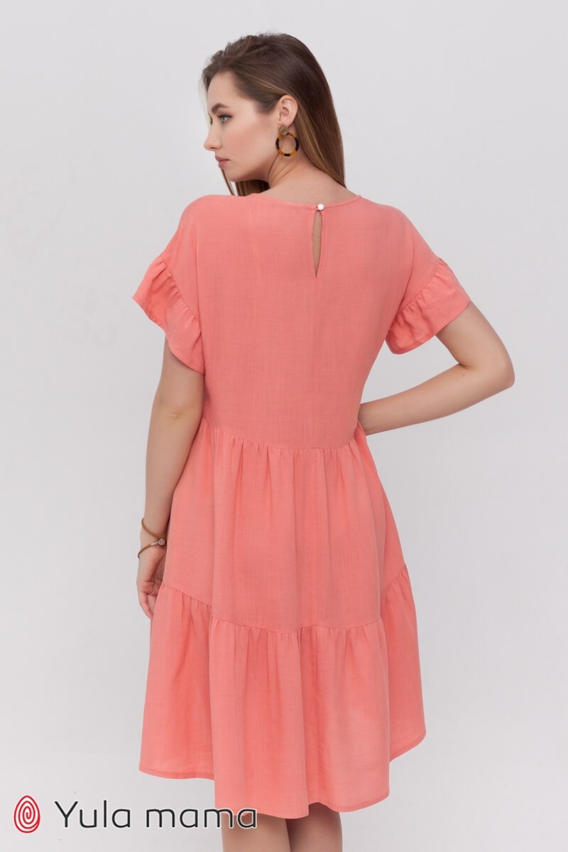 Вільне коралове плаття для вагітних та годуючих. Фасон оверсайз з воланами чудово виглядає на будь-якому терміні вагітності та потім. У нагрудних швах заховався секрет годування: потайні замочки. На спинці невеликий розріз з удзиком для зручного одягання.