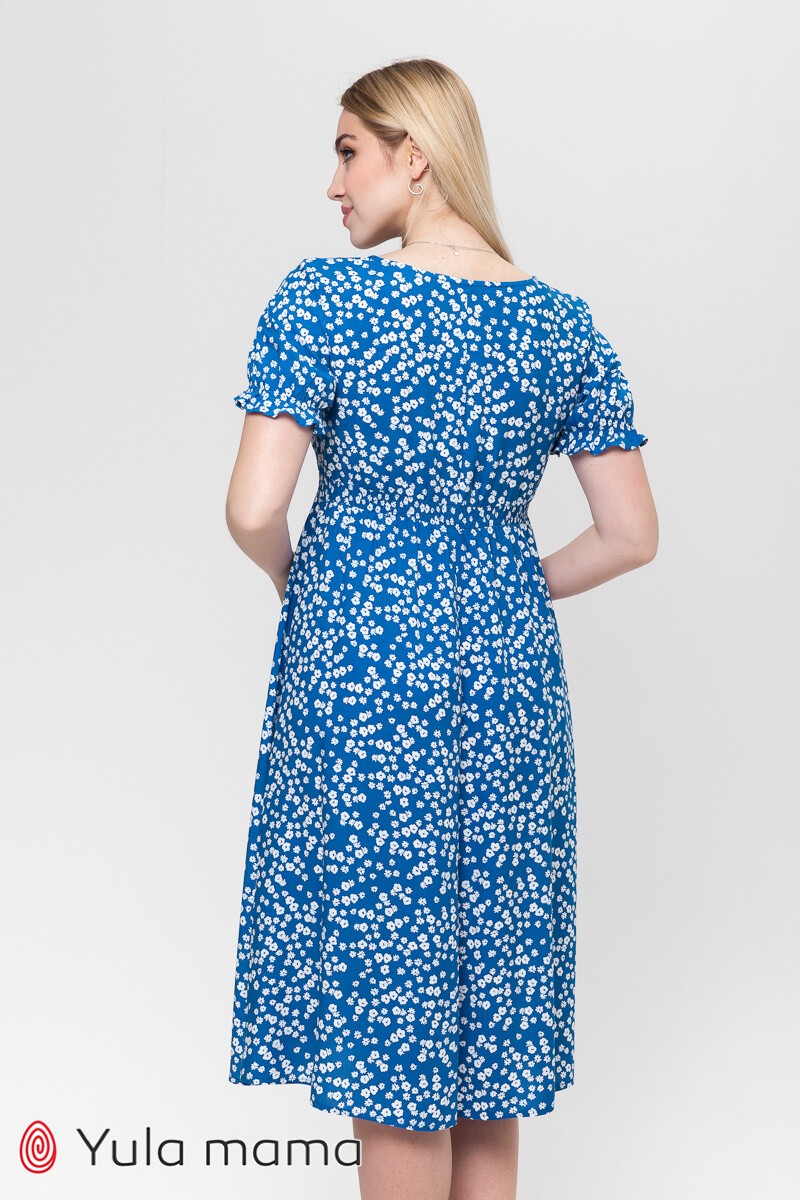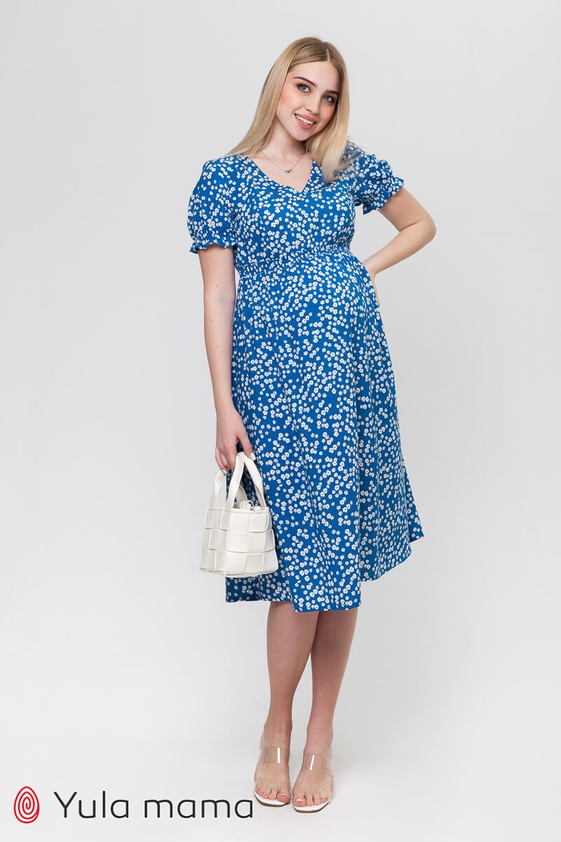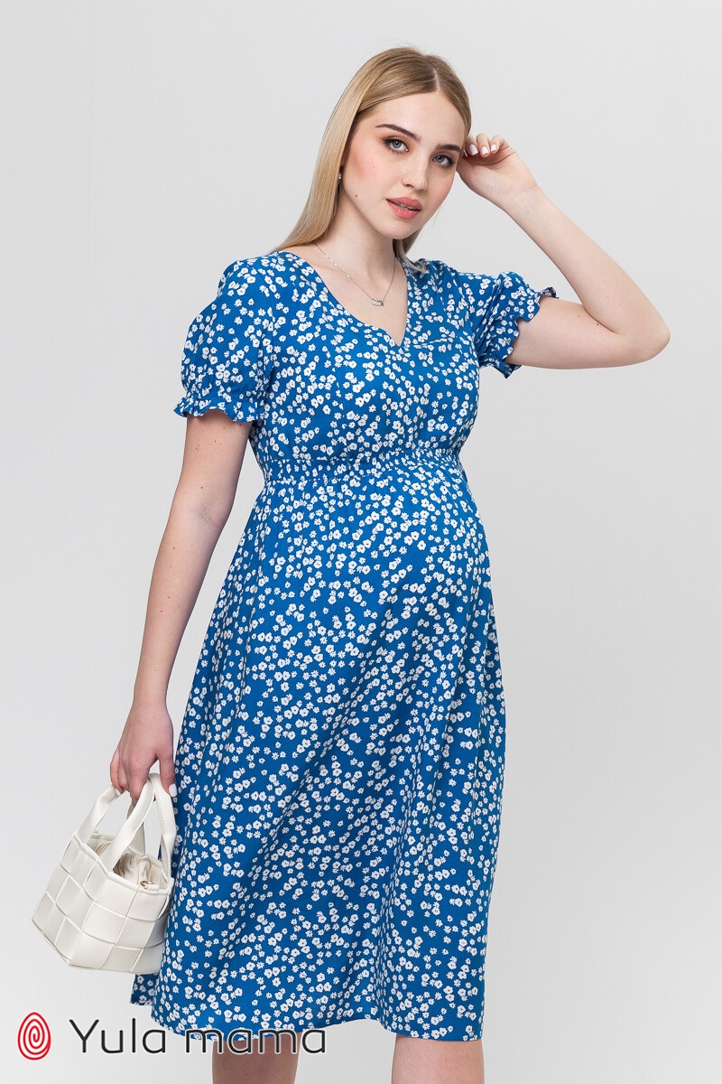 Літня синя сукня у квіточку для вагітних та годуючих мам. Має напівприлеглий ліф та зібрану спідницю дзвіночком. Є секрет годування: потайні замочки у нагрудних швах. Горловина оформлена V-подібним вирізом. Короткий рукав зібраний по краю рюшею. Дуже зручне та миле плаття.