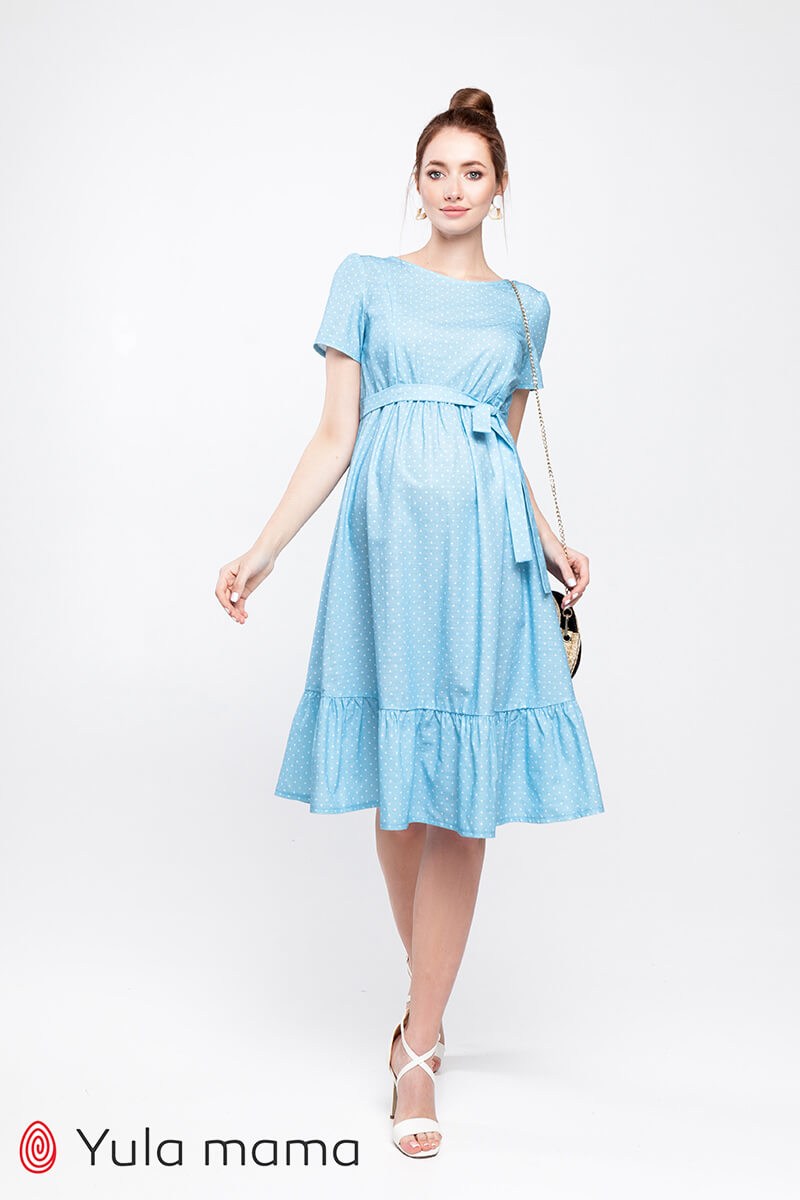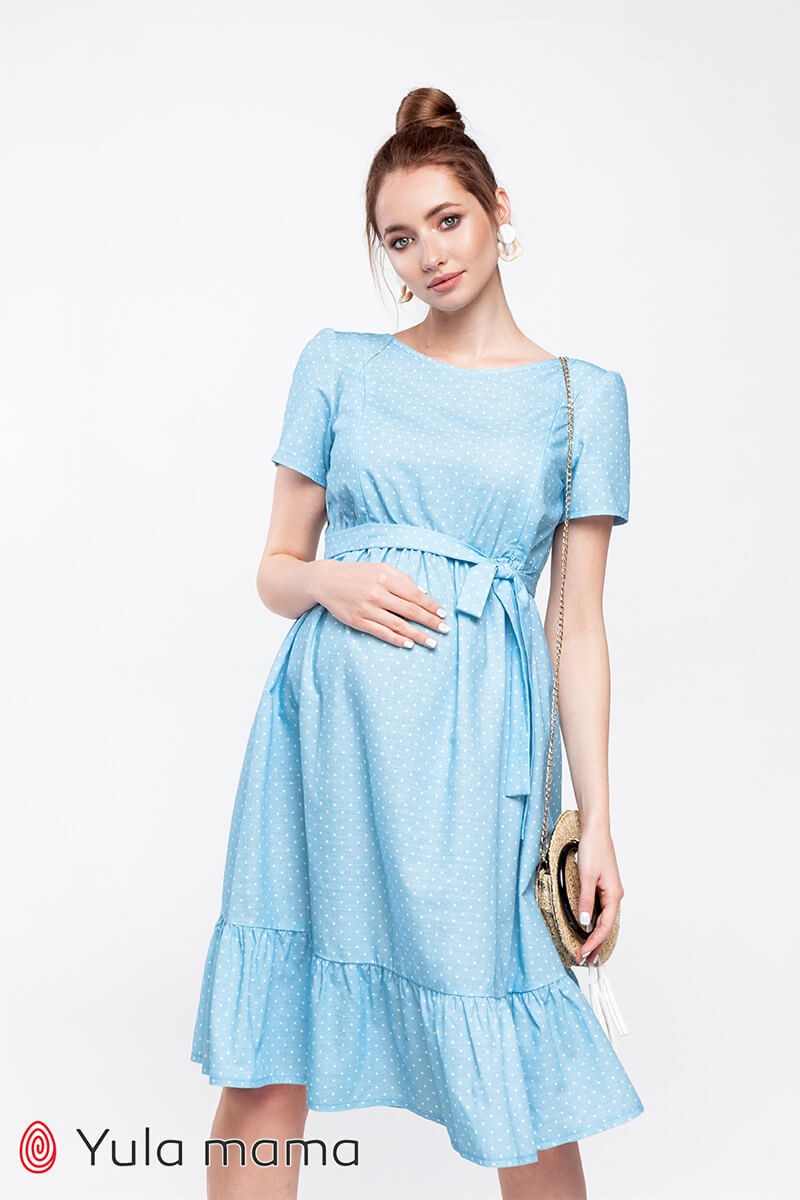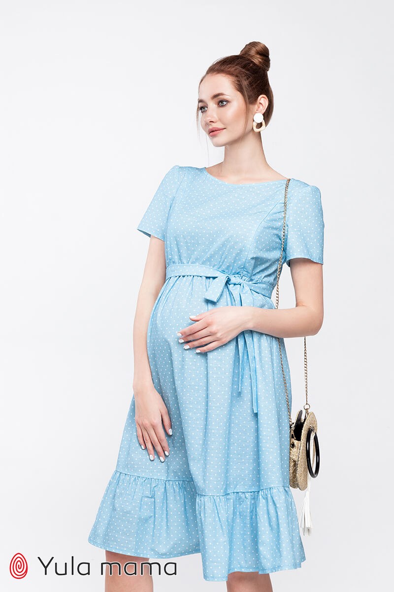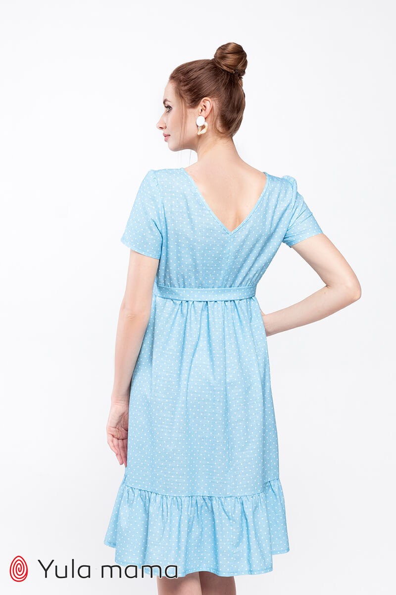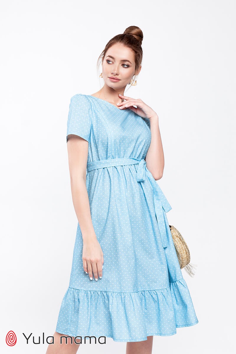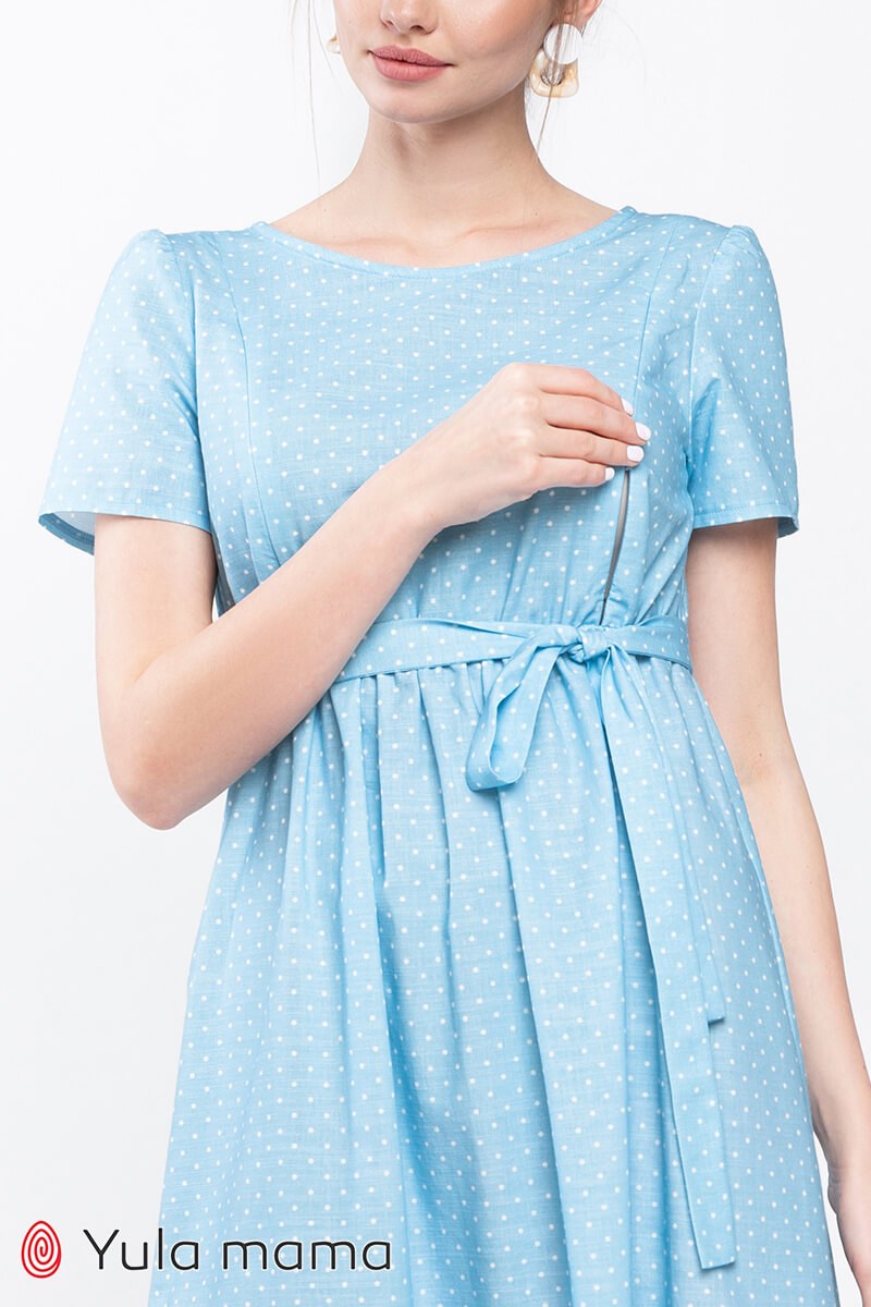 Літня блакитна сукня у горошок для вагітних та годуючих мам. Пошита з бавовняної тканини під льон (на вигляд нагадує льон). Крій зручний на будь-який термін вагітності. Напівоблягаючий ліф регулюється вшитими поясками під грудьми та має потайні замочки для годування малюка. Низ вільний. На спині трикутний виріз горловини. По краю сукні широкий волан.