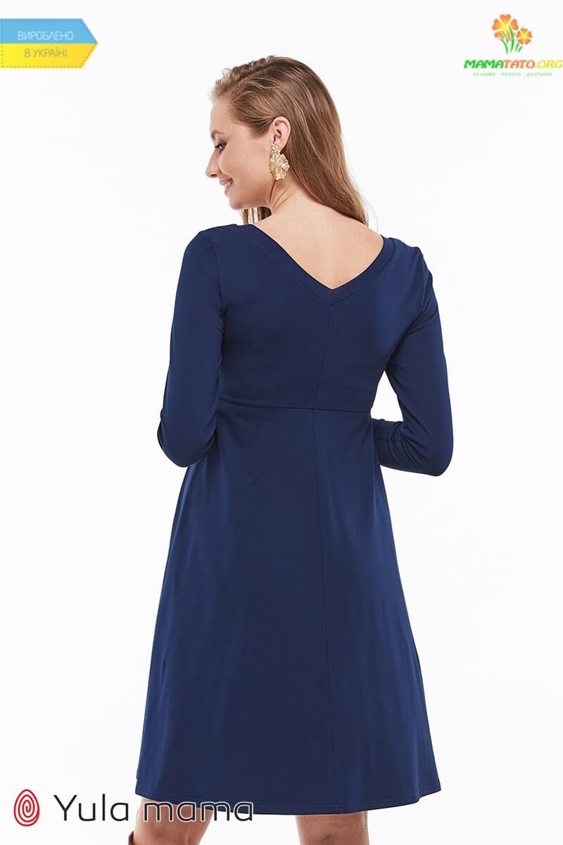 Лаконічна синя сукня для вагітних і годуючих. Виконана з бавовняного трикотажу. Горловина спереду округла, а на спині трикутний виріз. З довгим рукавом.