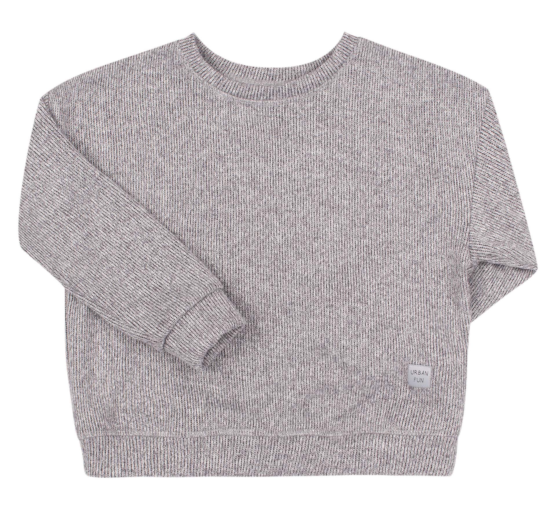 Сірий дитячий джемпер з в'язаного трикотажу. Приємний до тіла. Модель для хлопчиків. Має прямий вільний крій та круглу горловину. Внизу нашивка "Urban fun" (джемпер входить у лімітовану преміум колекцію осіннього дитячого одягу). Довгий рукав та край виробу зібрані манжетами.