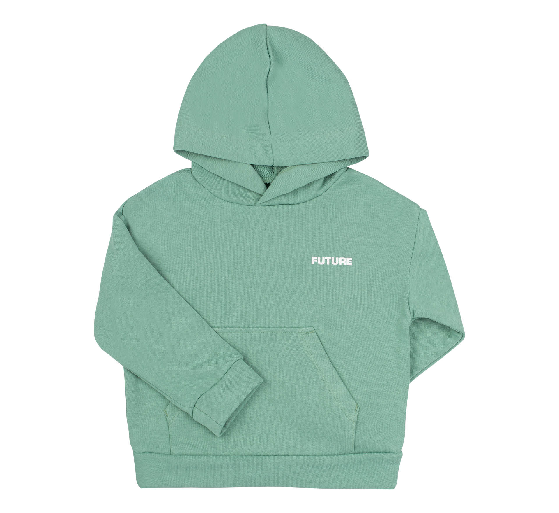 Дитяче м'ятне худі з капюшоном. Пошите з цупкого трикотажу тринитка. Зручне та стильне. Має вільний прямий крій та капюшон внахлест. Спереду збоку дитяча кофта з капюшоном прикрашена написом Future (з англ. Майбутнє). Довгий рукав закінчується манжетою. Спереду велика кишеня-кенгуру.